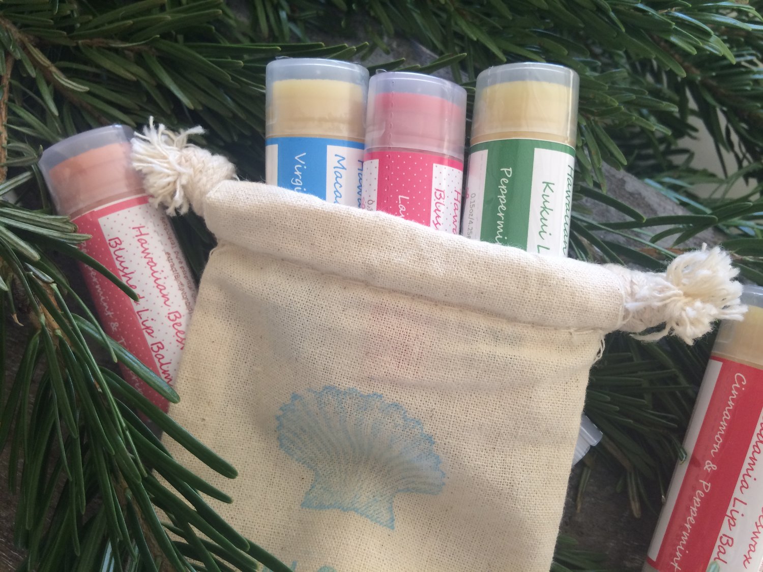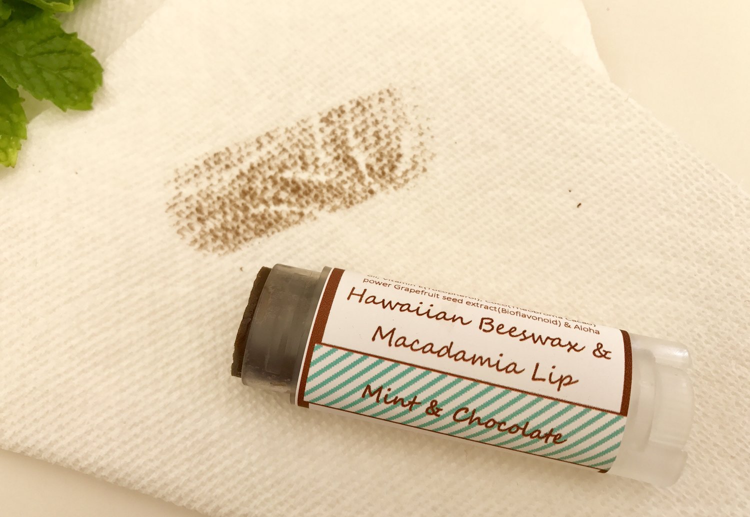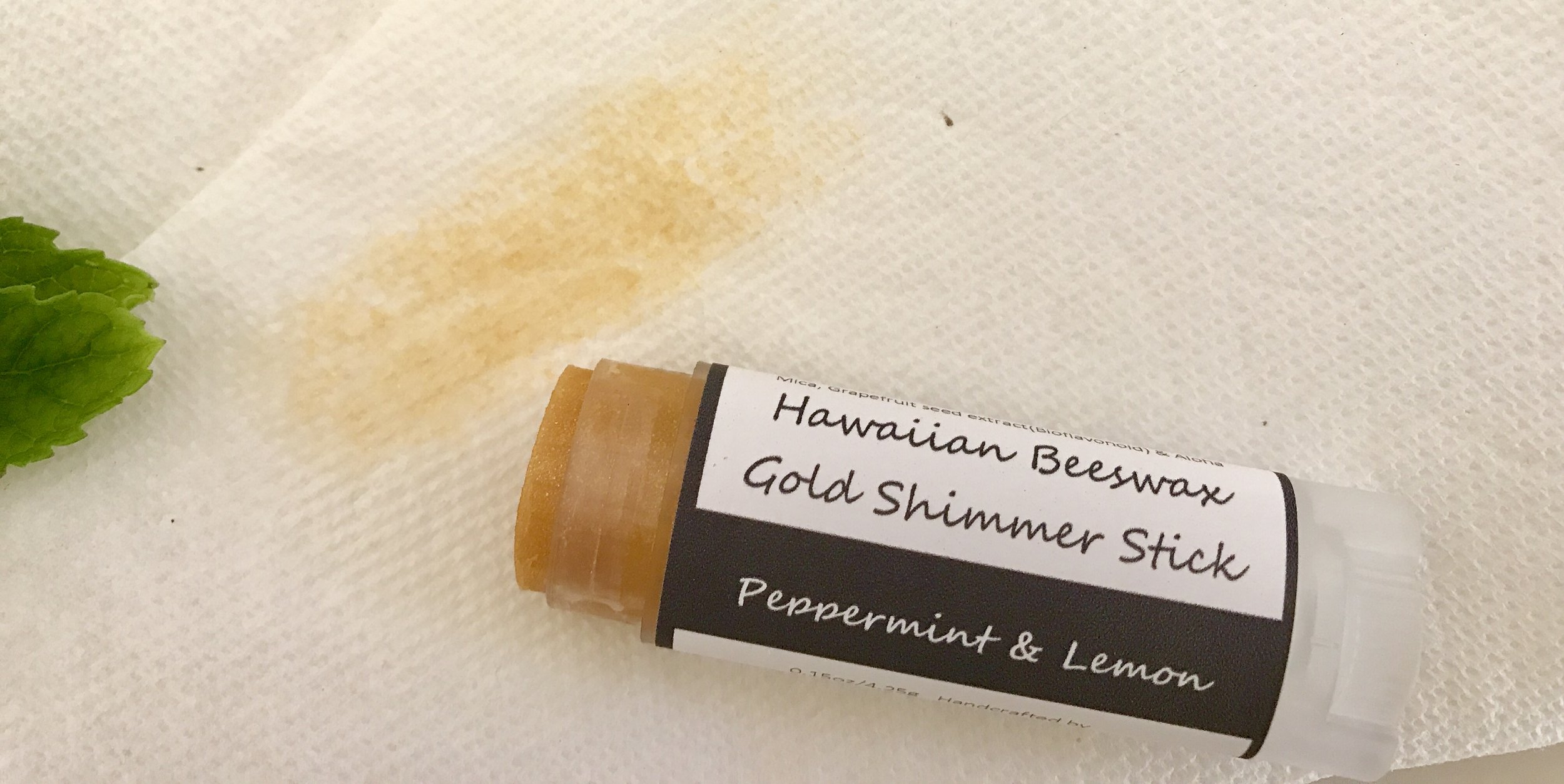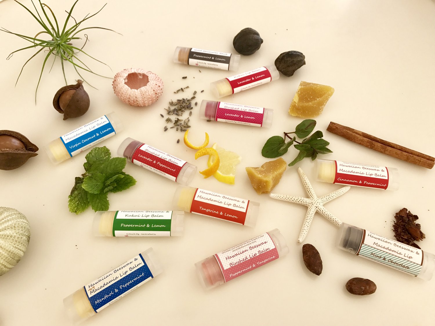 Hawaiian Beeswax, Olive oil, Castor oil, Jojoba oil, Coconut oil, Aloe, vitamin E, Grapefruit Seed Extract, Aloha, Pure therapy grade essential oils, Kukui Nut or Macadamia oil, coco butter (in some variety), and Aloha