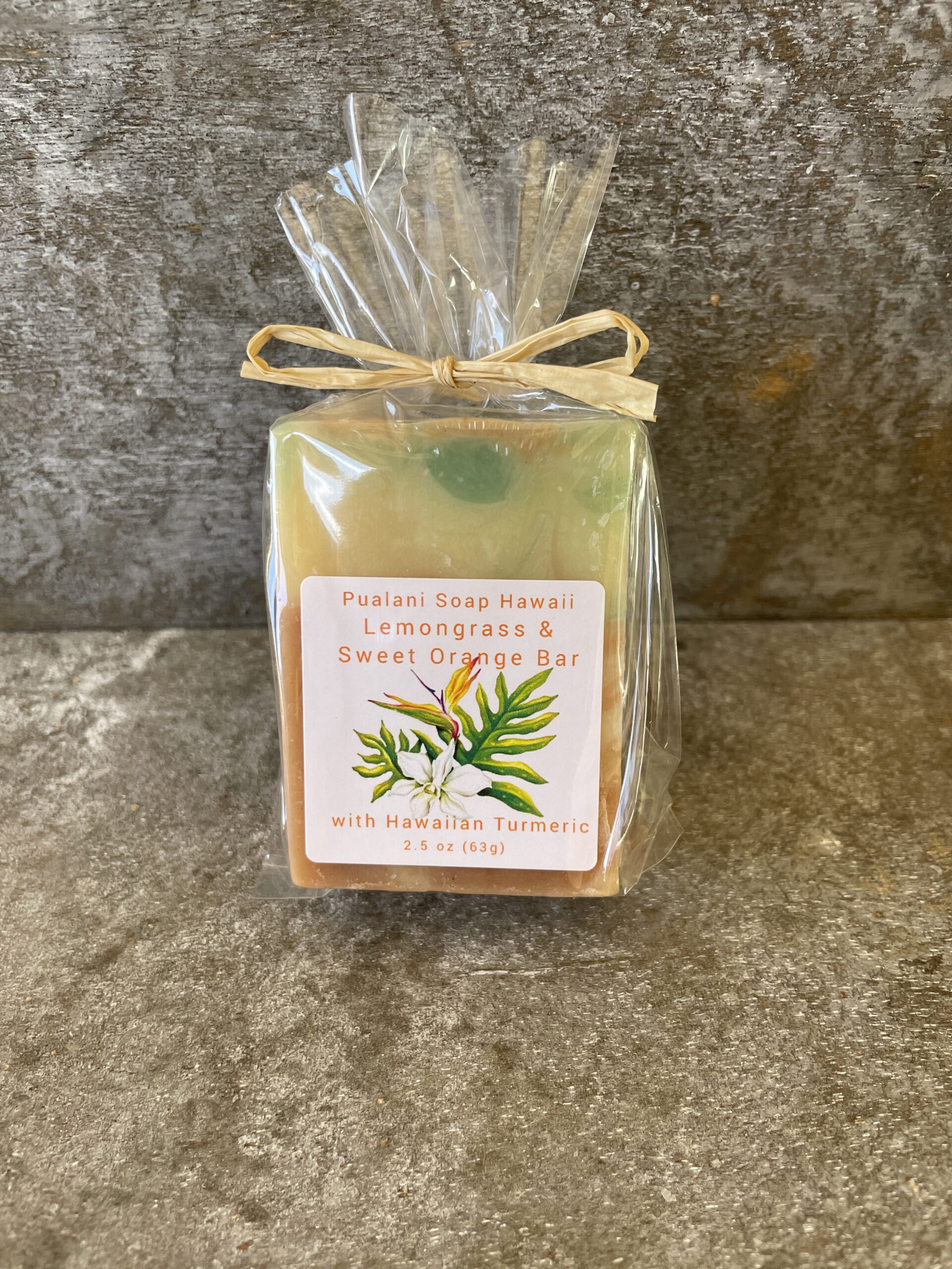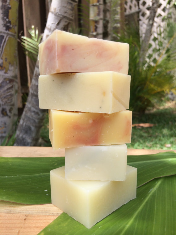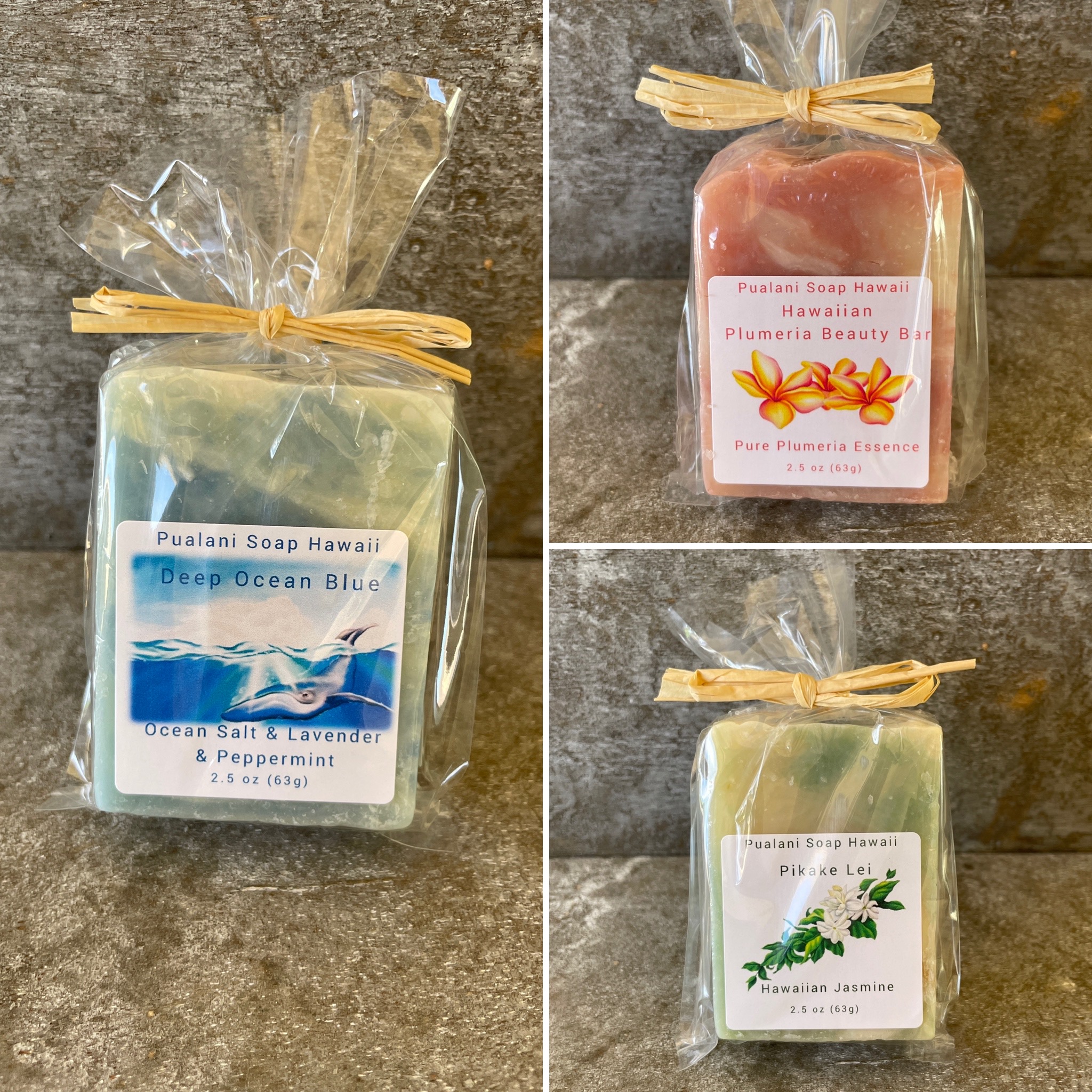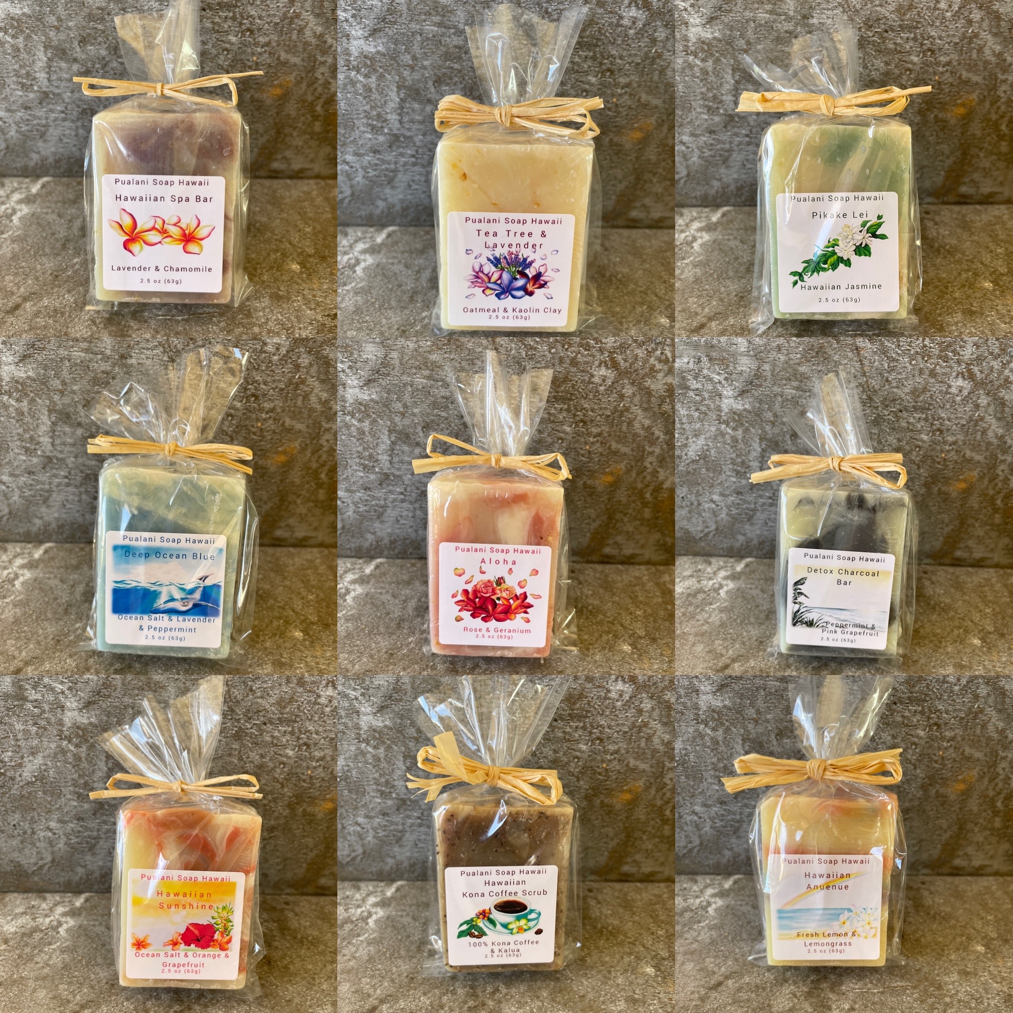 Pure olive oil, Coconut oil, Palm oil, Castor oil, Aloe butter, Hawaiian Kukui Nut oil, Organic and natural jojoba oil, Hawaiian solar charged purified water, Lye, Pure essential oils (varies), Kona deep ocean salt, Pure Hawaiian honey, Grapefruit seed extract, and Aloha