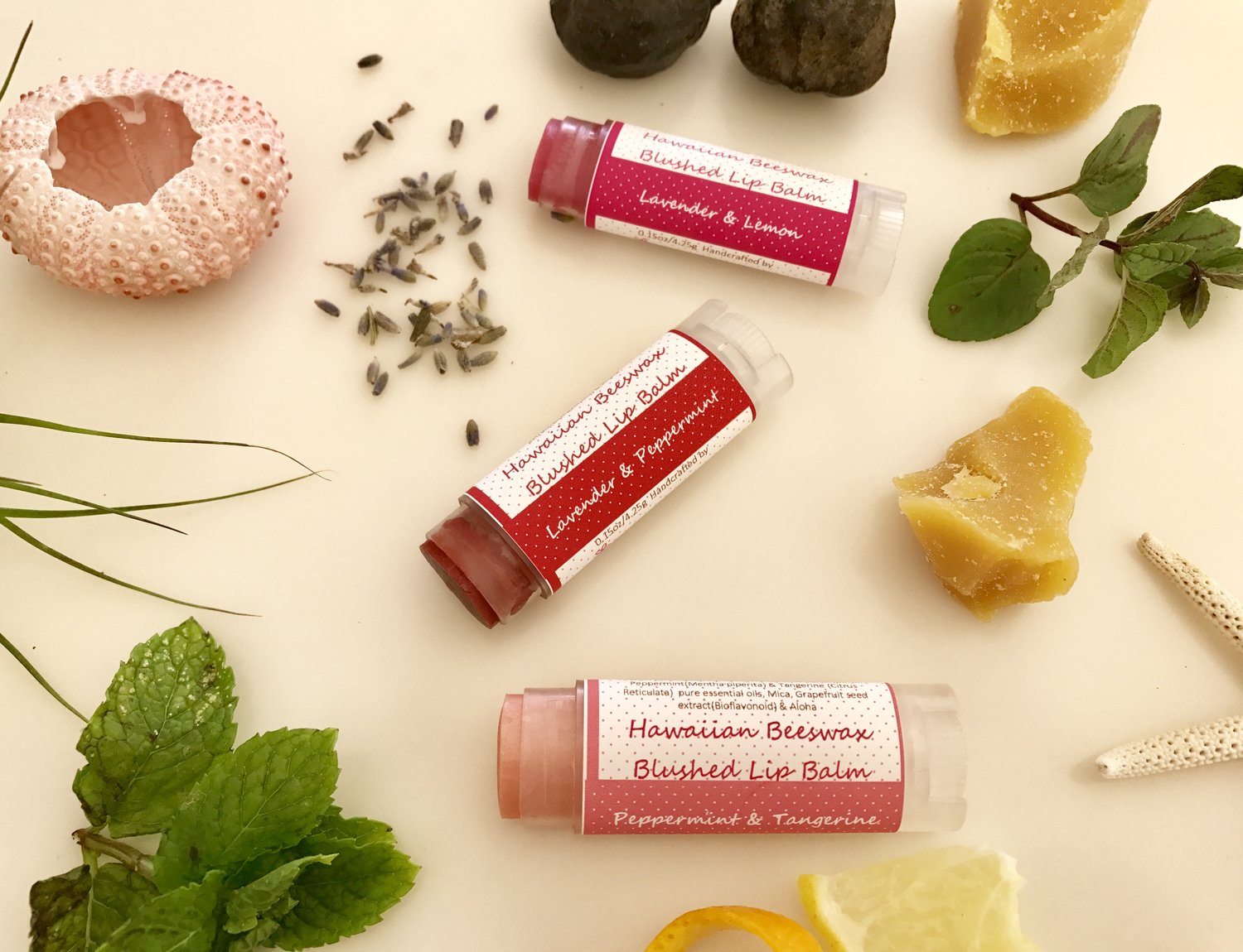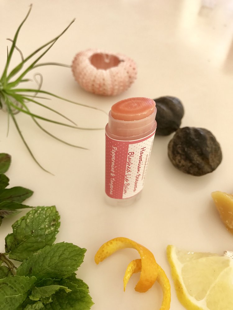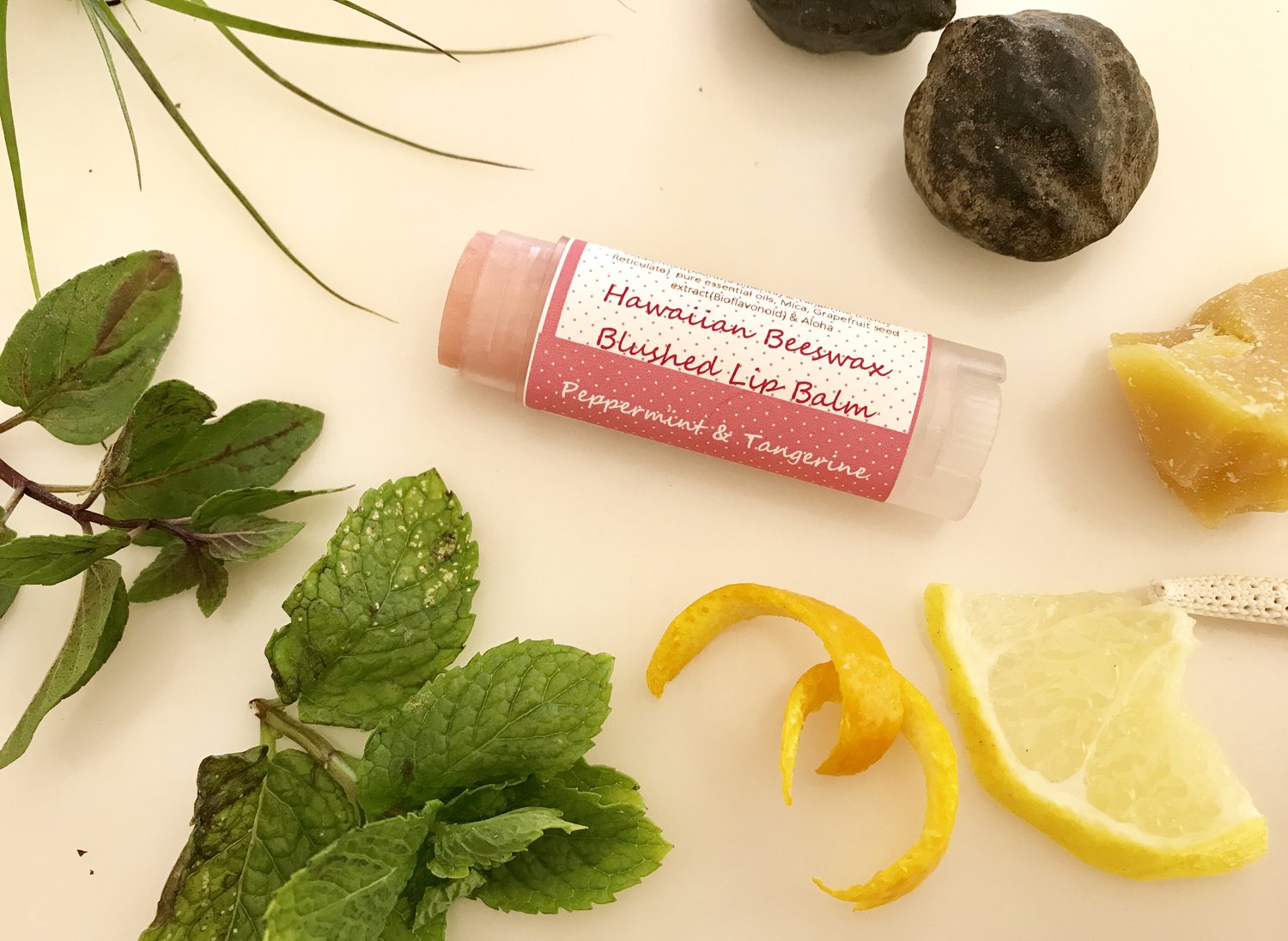 Ingredient List: Hawaiian Beeswax, Olive, Castor, Kukui Nut, Jojoba, Coconut oils, Aloe, Cocoa Butter, Vitamin E, pure Tangerine & Peppermint essential oils (Therapy Grade), FDA approved natural mica color, Grapefruit Seed Extract, and Aloha