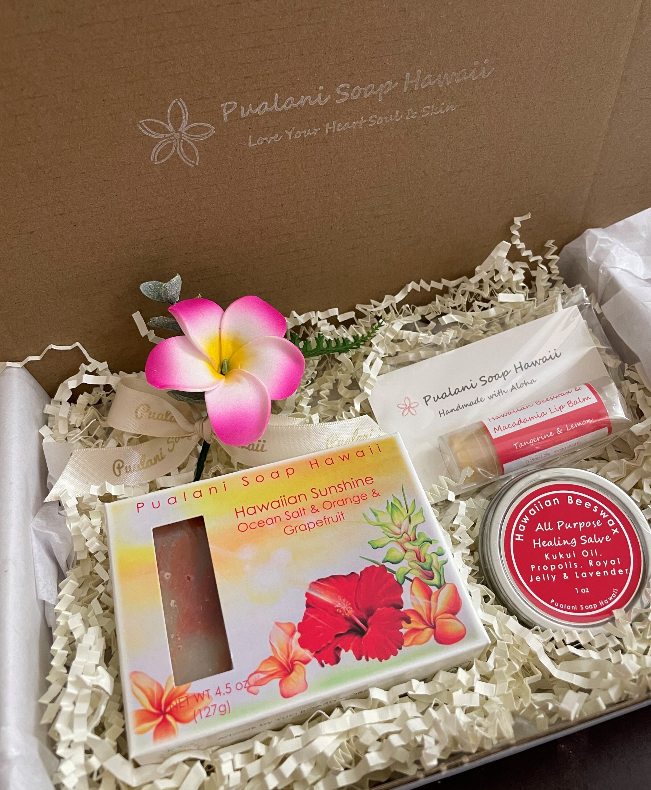 It is the perfect gift for many occasions. Good for Housewarming, Welcome gift, Teacher’s gift, Birthdays, Mother’s Day and Holidays. Create your own set by choosing your favorite Soap, Lip Balm, and Hawaiian Beeswax Salves.