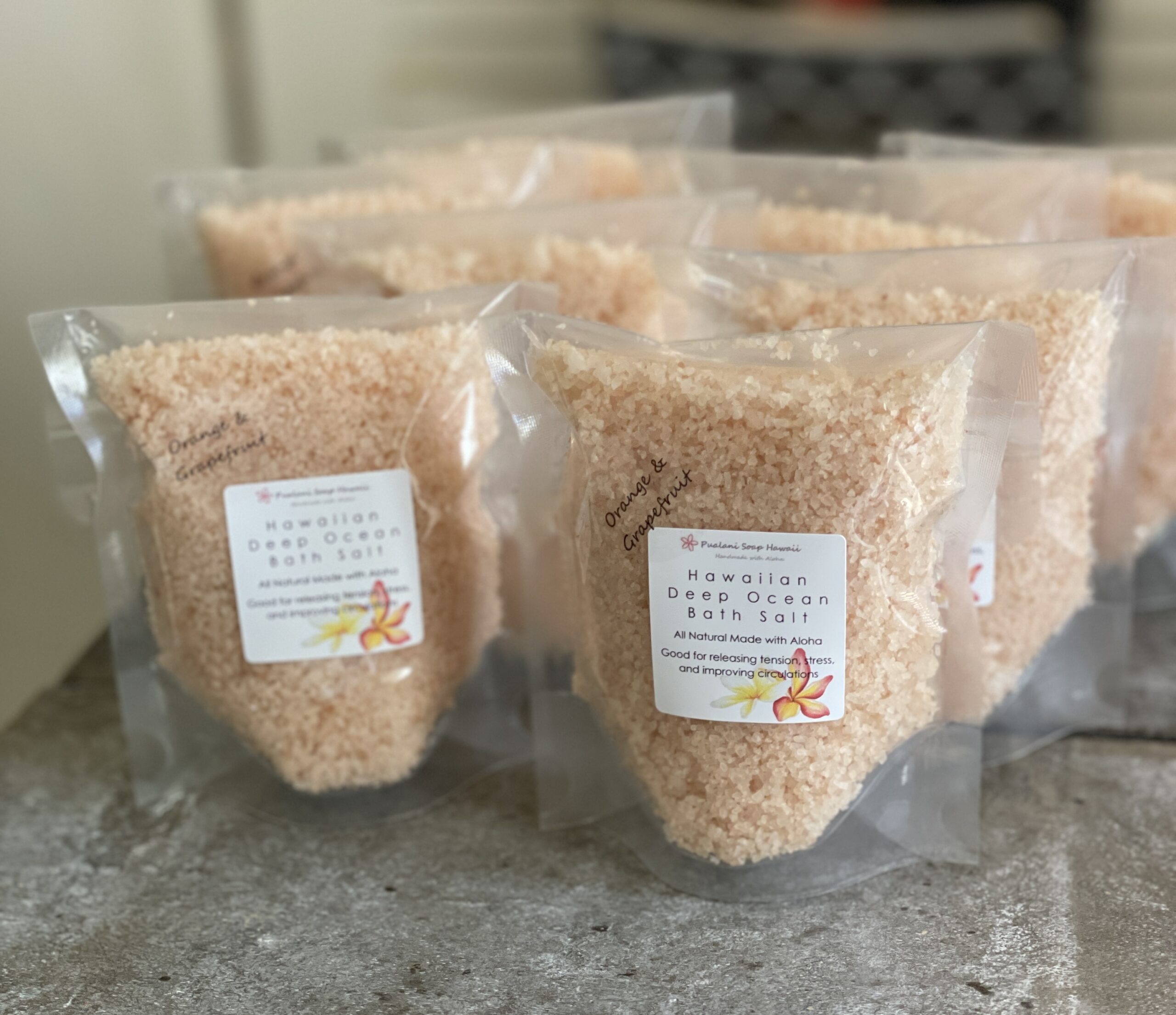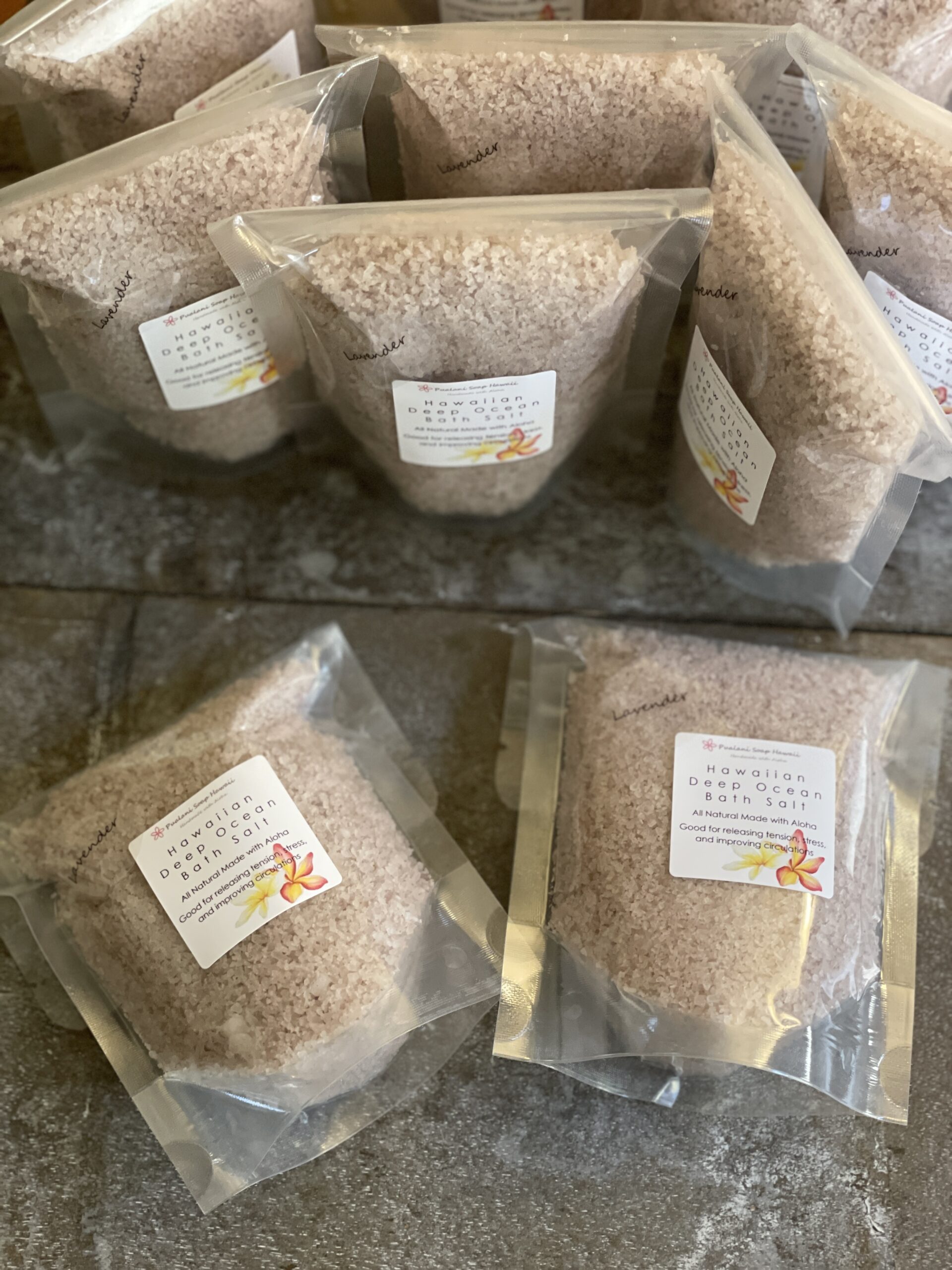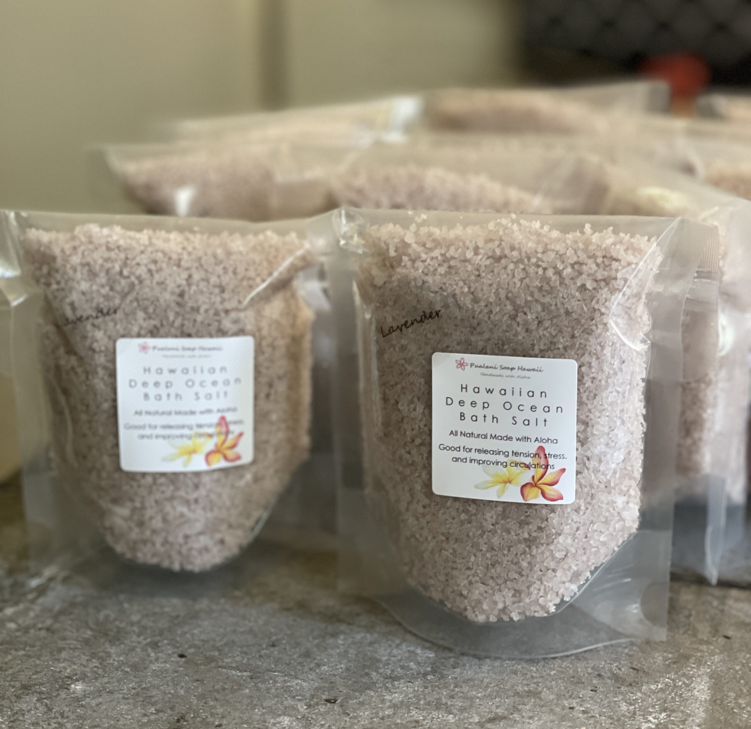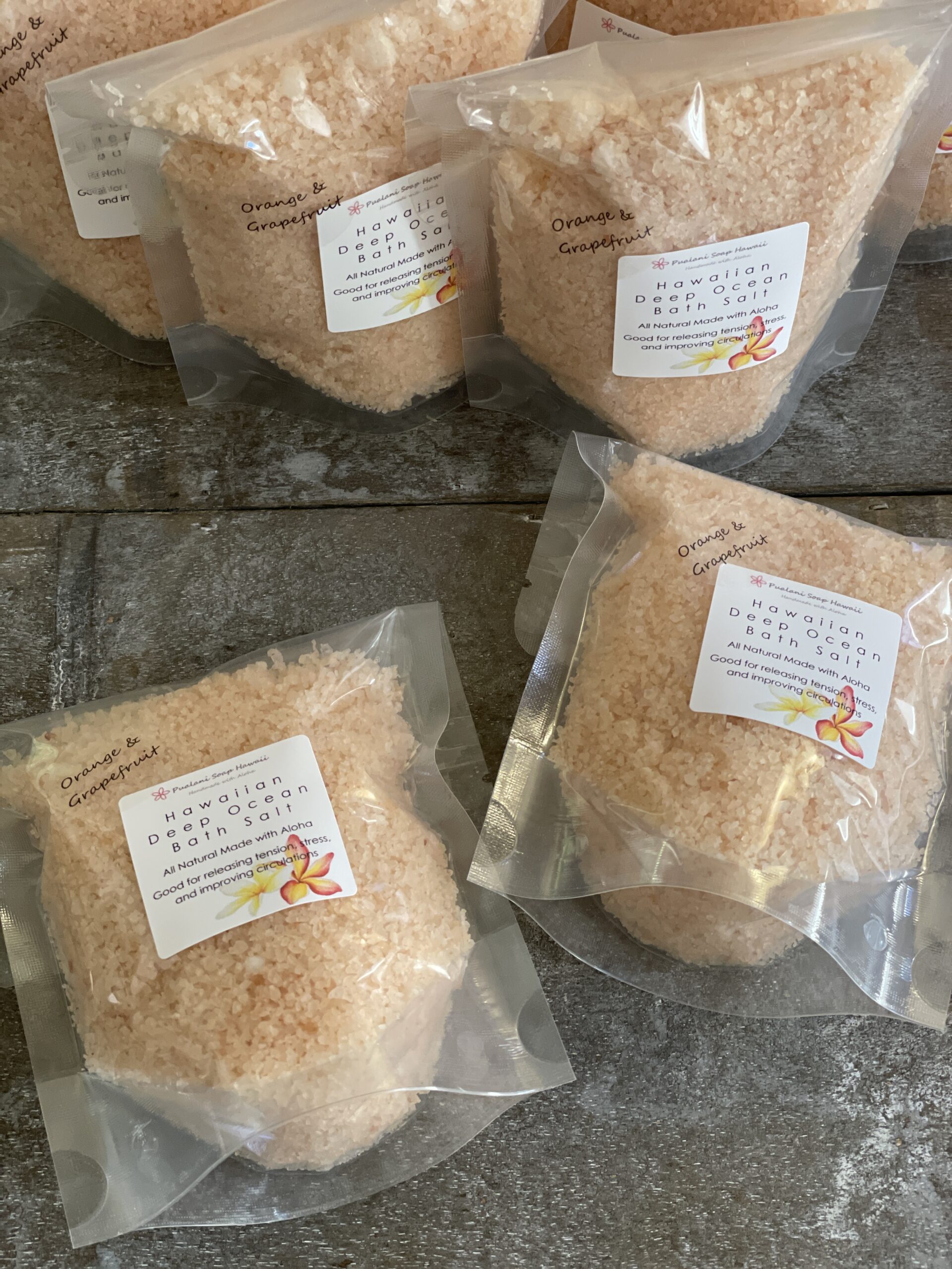 ハワイ島コナ沖の深海水からとれた純度の高い塩を使用。ハワイ産ククイナッツ油、ホホバ油はお肌を乾燥したお肌をやさしく包んでくれます。香りは純正アロマオイルでやさしくつけてあります。