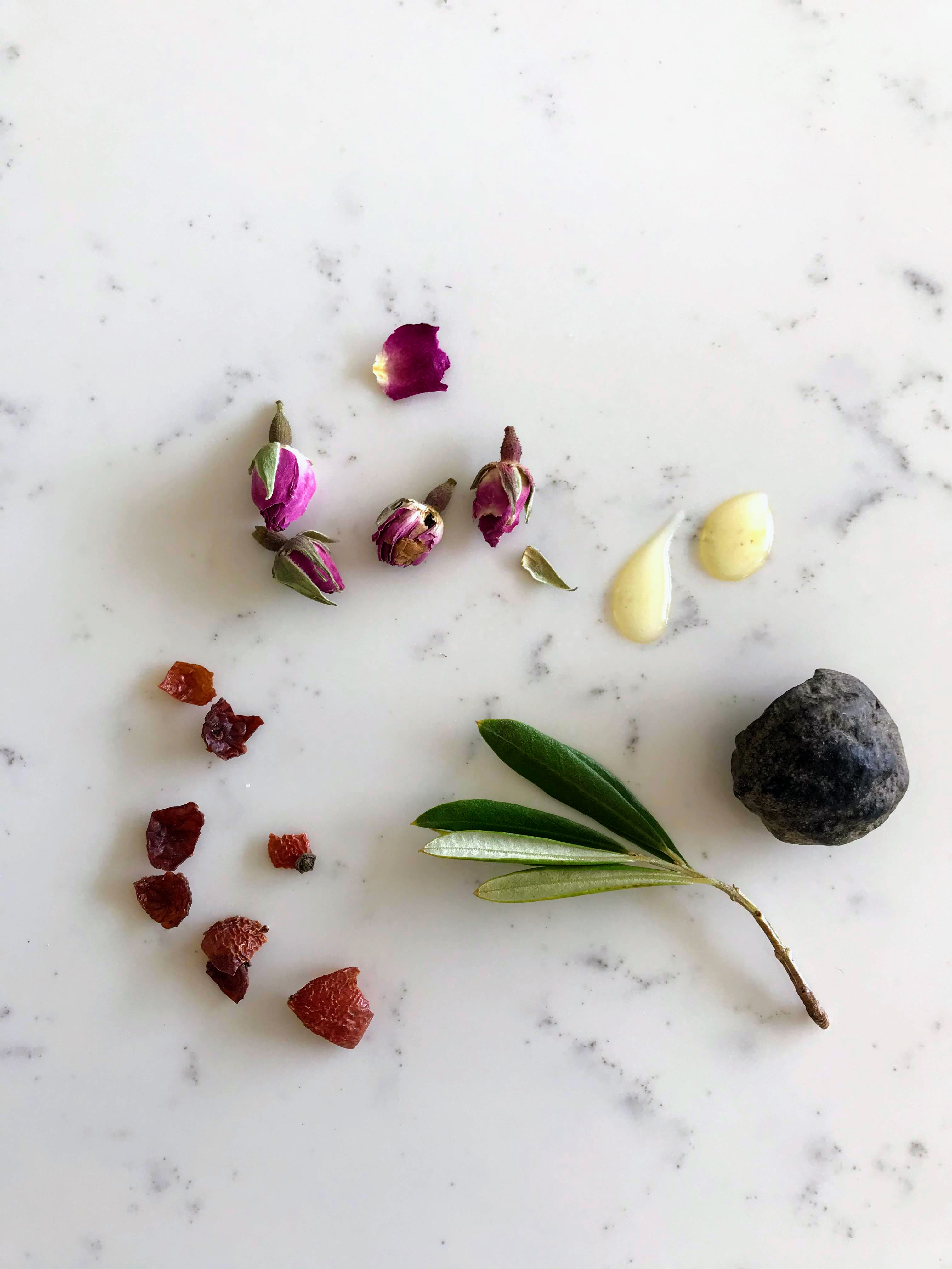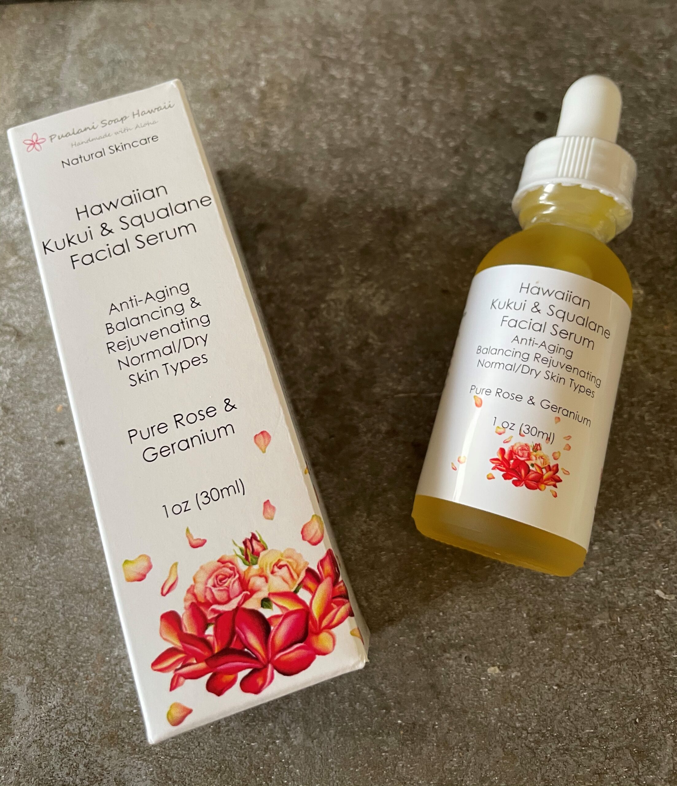 Hawaiian Kukui, Jojoba, Olive Squalane, Rosehip seed oils, Vitamin E, Pure Rose Otto and Geranium Essential Oil, Grapefruit Seed Extract, and Aloha