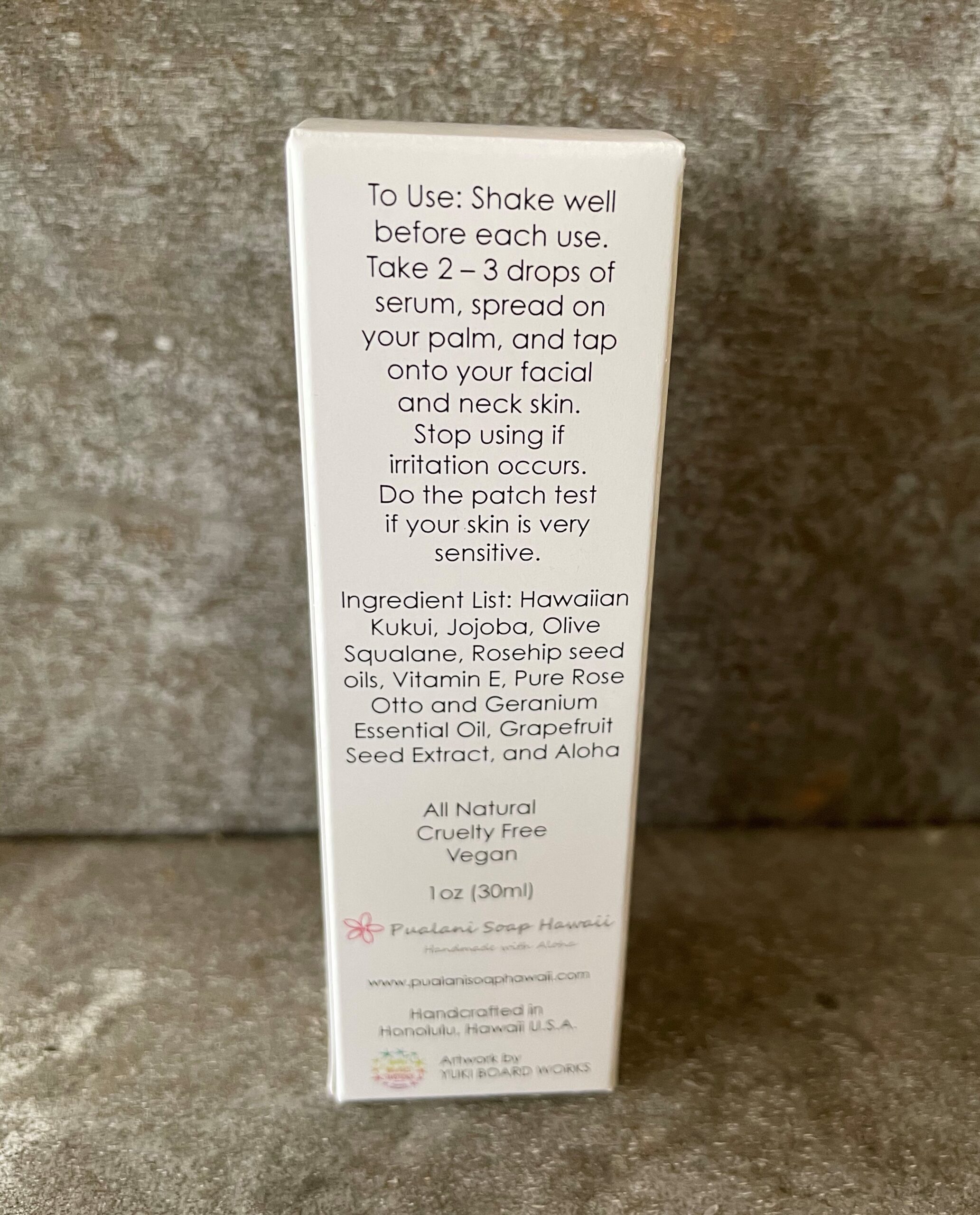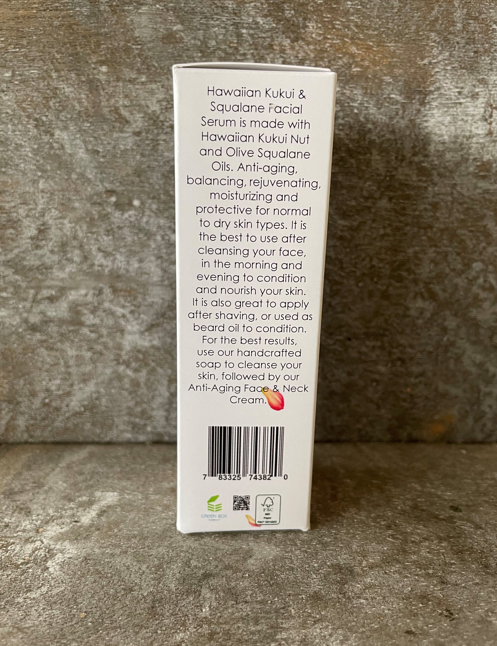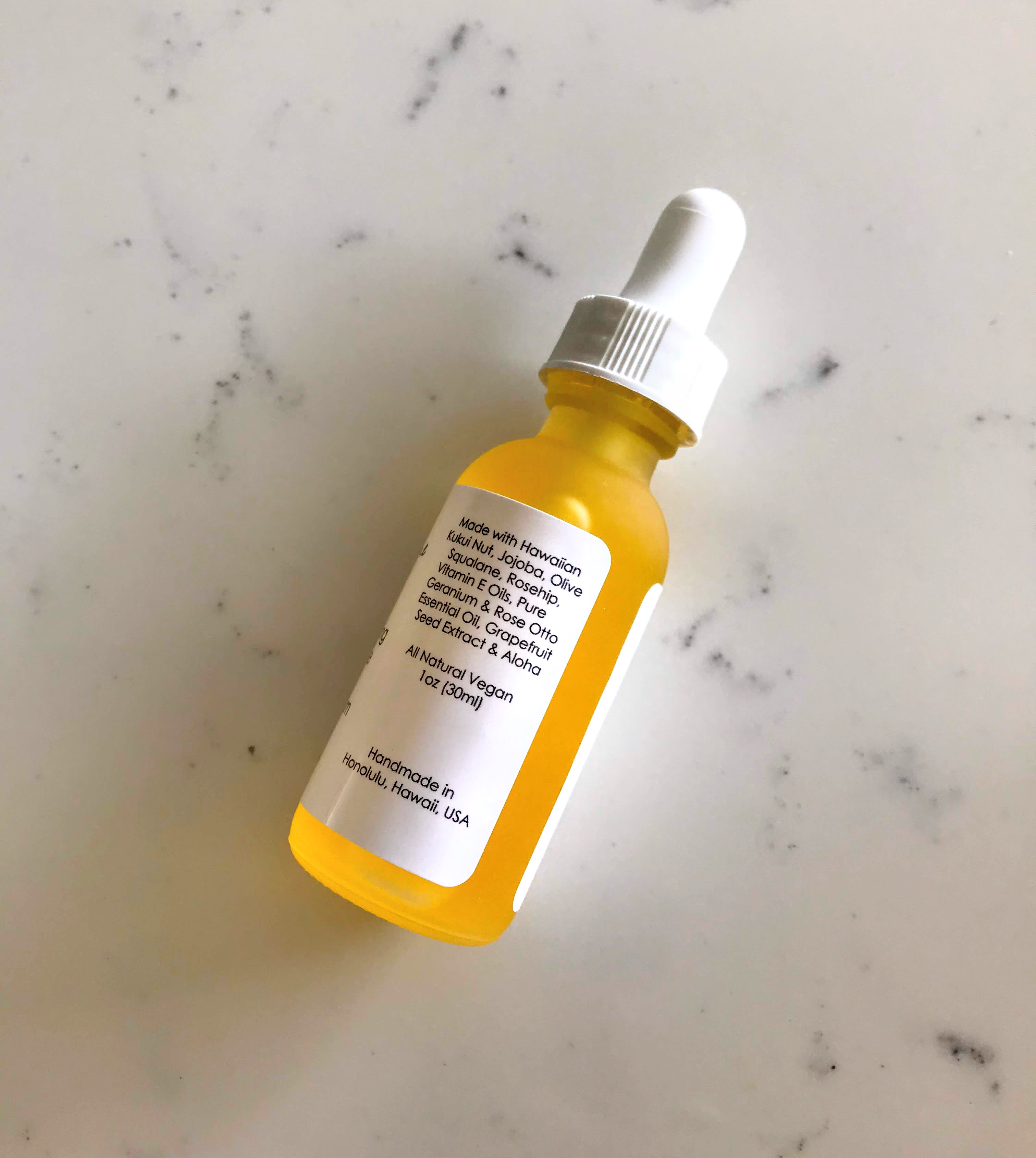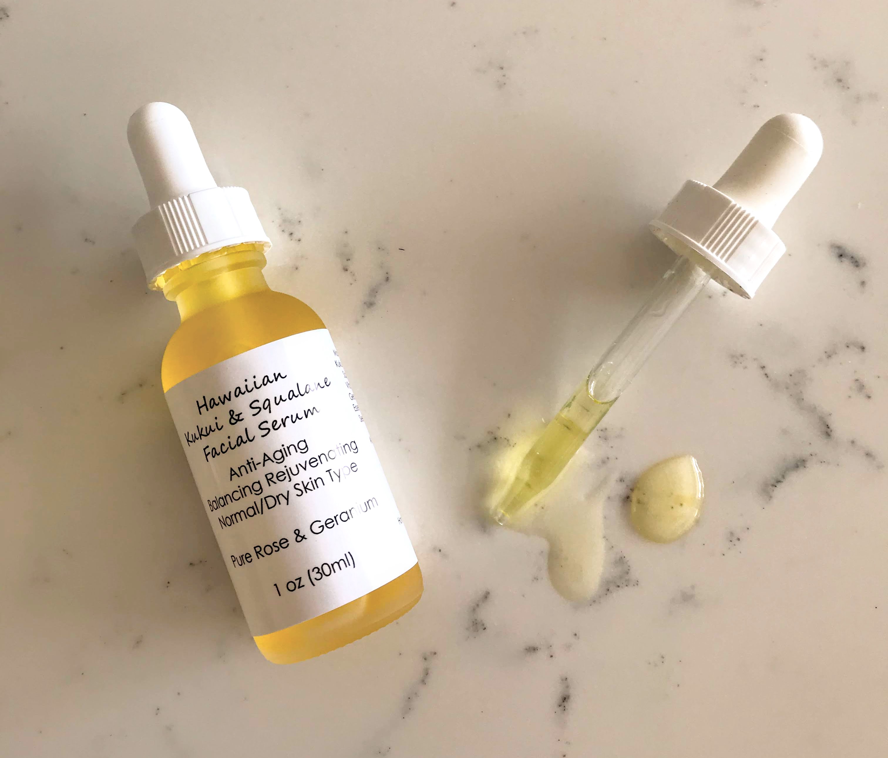 Made with Hawaiian Kukui Nut and Olive Squalane Oils. Anti-aging, balancing, rejuvenating, moisturizing and protective for normal to dry skin type. It is the best to use after cleansing your face, in the morning and evening to condition and nourish your skin. It is also great to apply after shaving, or used as beard oil to condition. For the best results, use our handcrafted soap to cleanse your skin, followed by our Anti-Aging Face & Neck Cream.