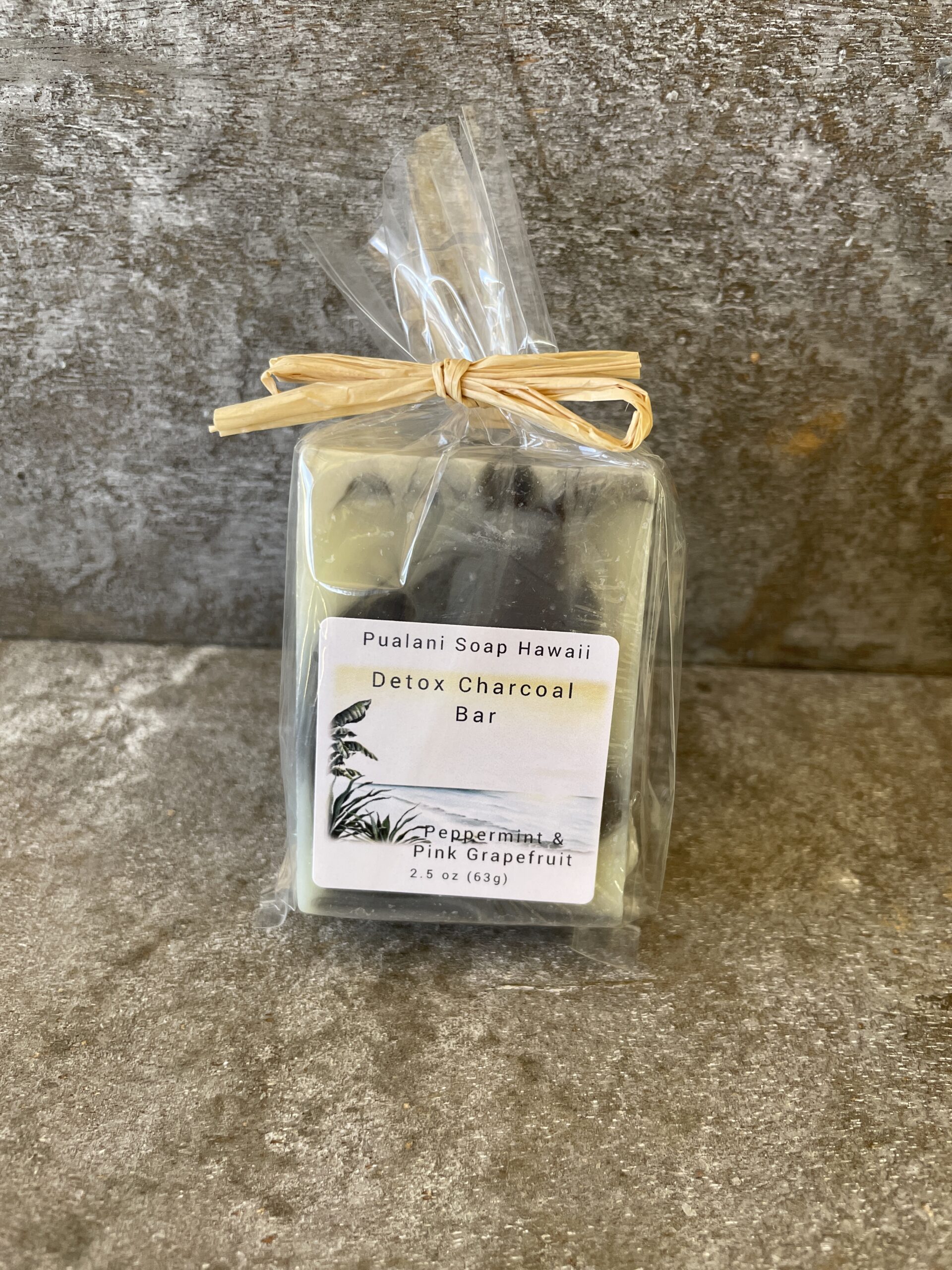 Pure olive oil, Coconut oil, Palm oil, Caster oil, Hawaiian Kukui nut oil, Organic jojoba oil, Aloe butter, Hawaiian solar charged purified water, Lye, peppermint and pink grapefruit pure essential oils, Pure Hawaiian honey, Activated charcoal powder, Mineral color, Grapefruit seed extract, and Aloha